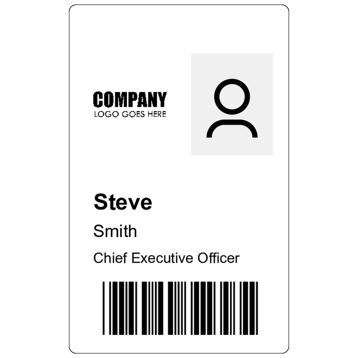 | Clean vertical design with a logo area, photo ID, role details, and a barcode for fast scanning. | ||
