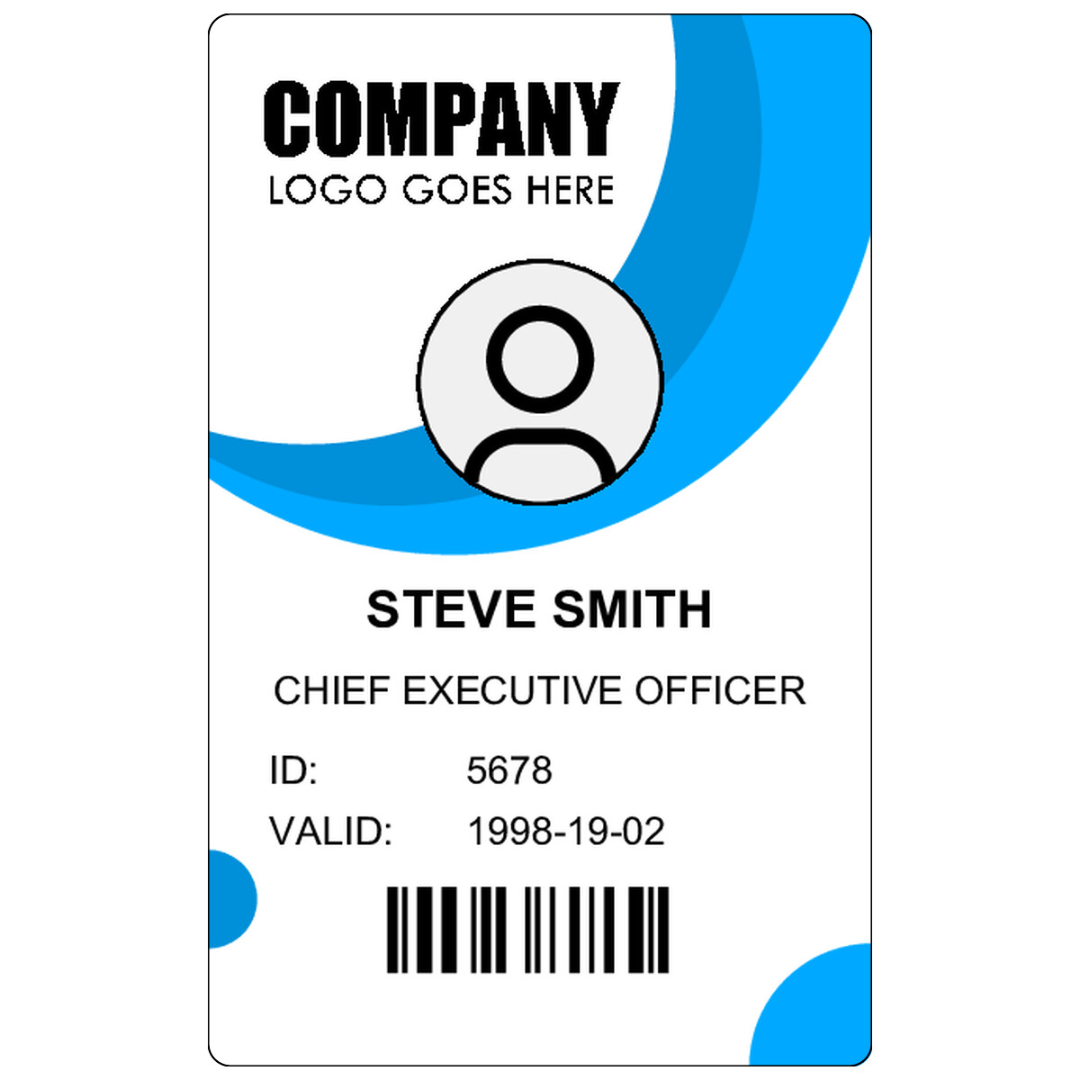 | Modern vertical design with circular accents, photo focus, identity details, and a barcode for fast verification. | ||