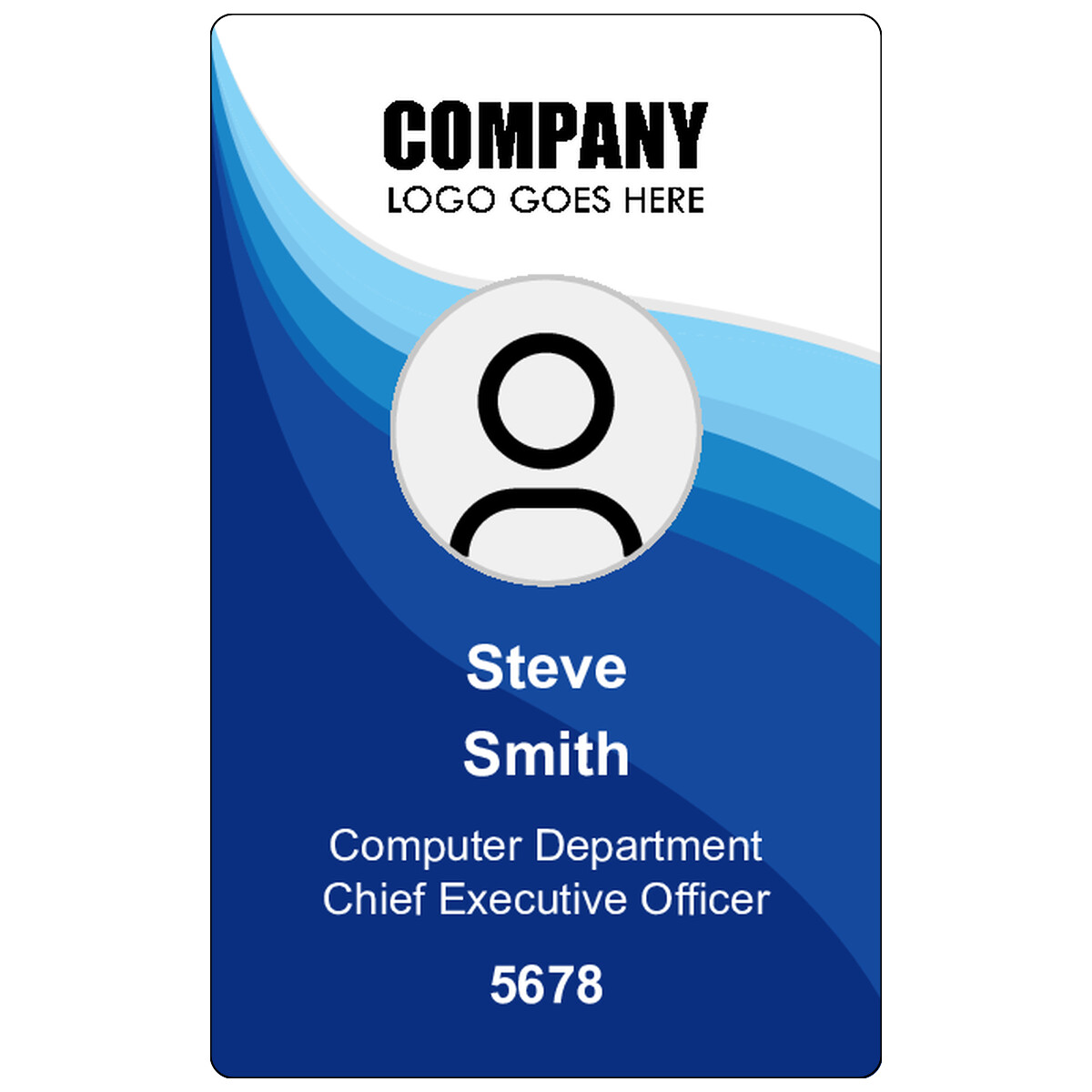 | Professional vertical design with photo area, name, department, role, ID number, and layered graphic background. | ||