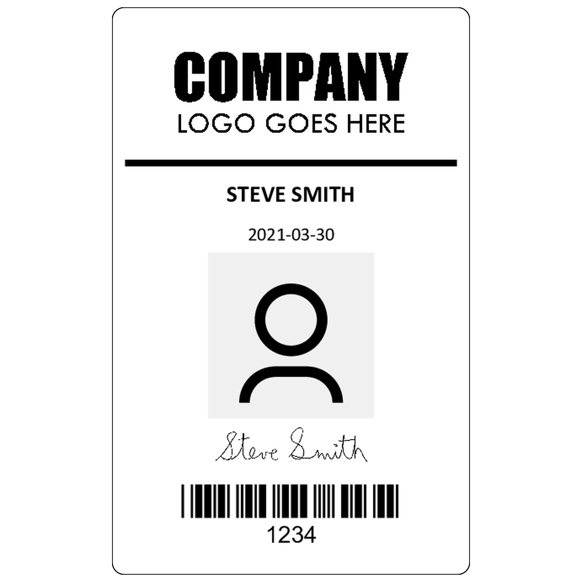 | Minimal vertical design with a centered photo, signature area, date field, and barcode for identification. | ||