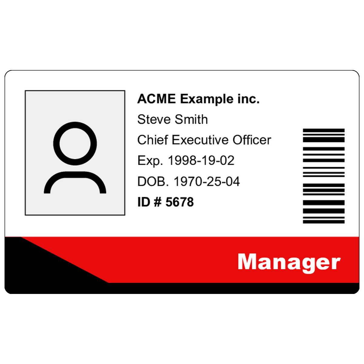 | This layout has one background image, one photo ID, one text, six dynamic texts, and one barcode you can print on the badge, and it's using color-coding. | ||