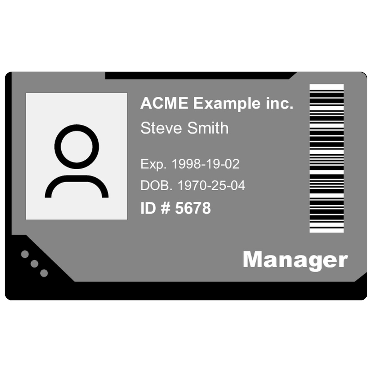 | Classic horizontal design with an SVG background, high-contrast role label, identity details, and a barcode. | ||