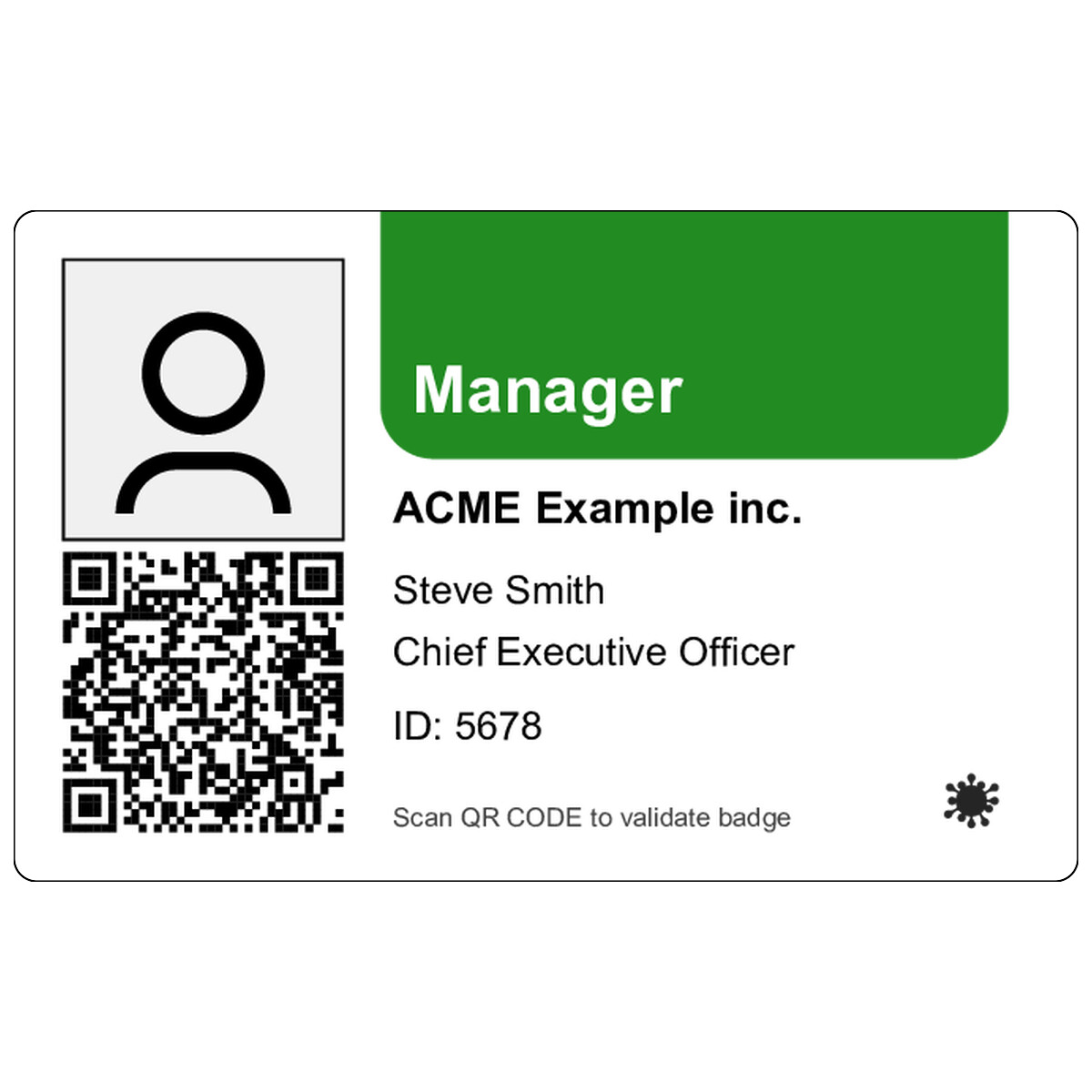| This layout has one background image, one photo ID, three texts, three dynamic texts, and one QR Code you can print on the badge, and it's using color-coding. | ||