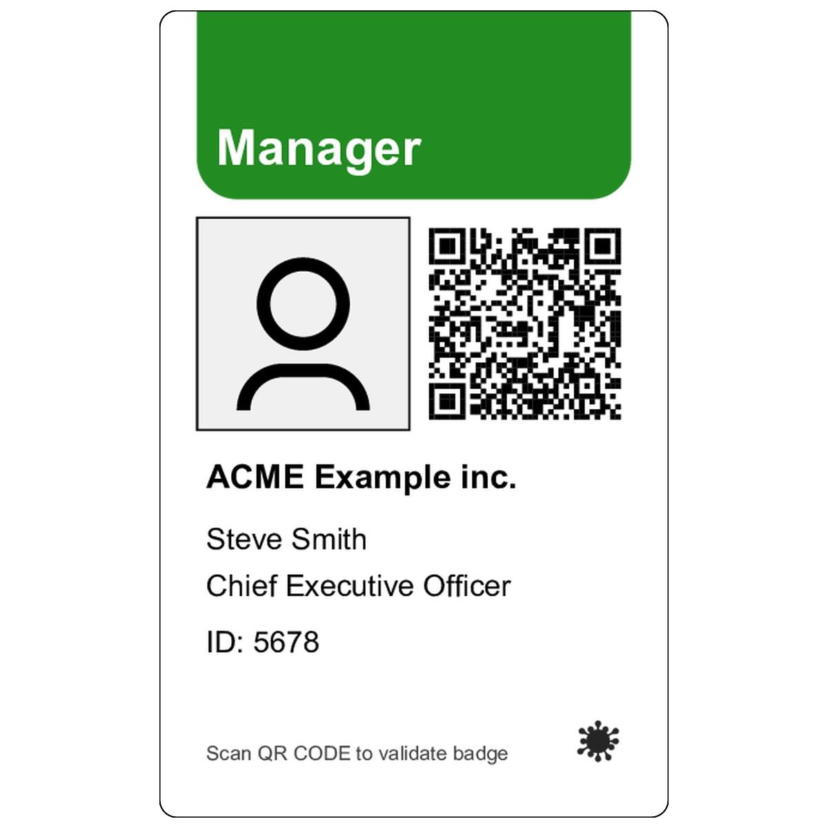 | This layout has one background image, one photo ID, three texts, three dynamic texts, and one QR Code you can print on the badge, and it's using color-coding. | ||