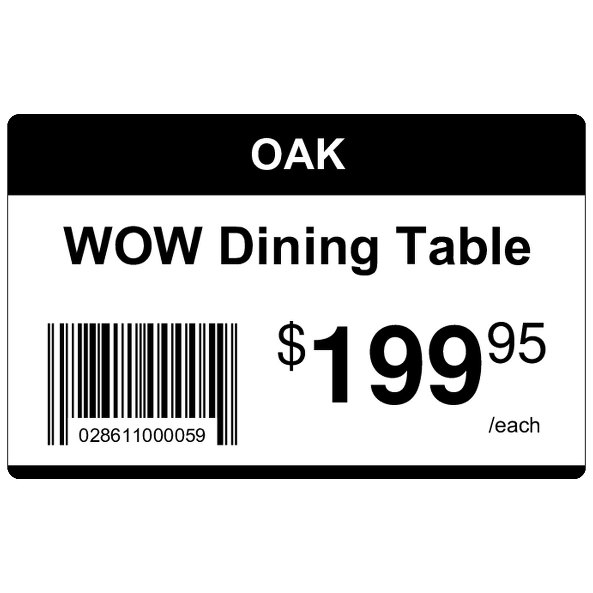 | Horizontal high-contrast price tag with product name, barcode, and large pricing for chain stores. | ||