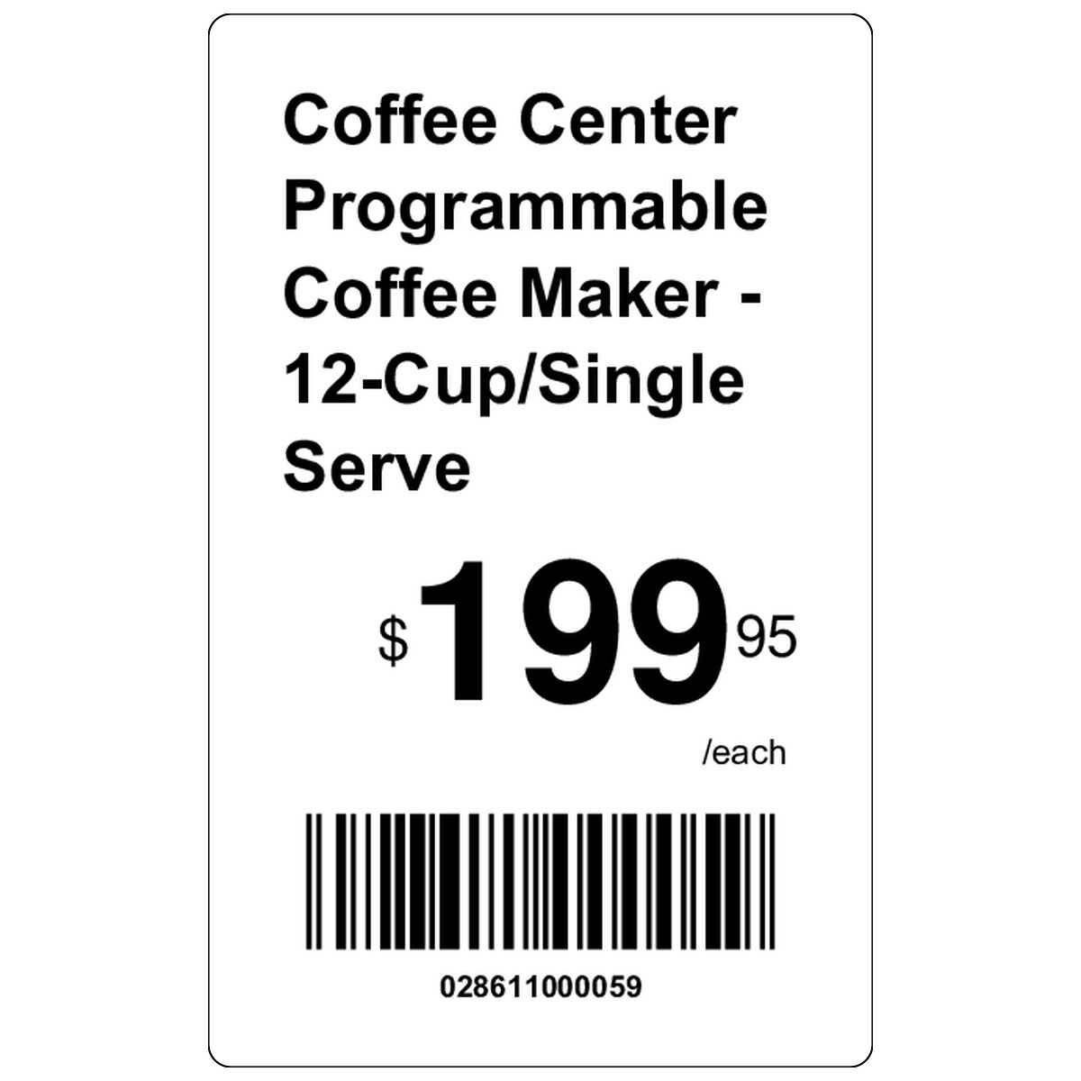 | Vertical minimalist price tag with product name, barcode, and large pricing for compact retail displays. | ||